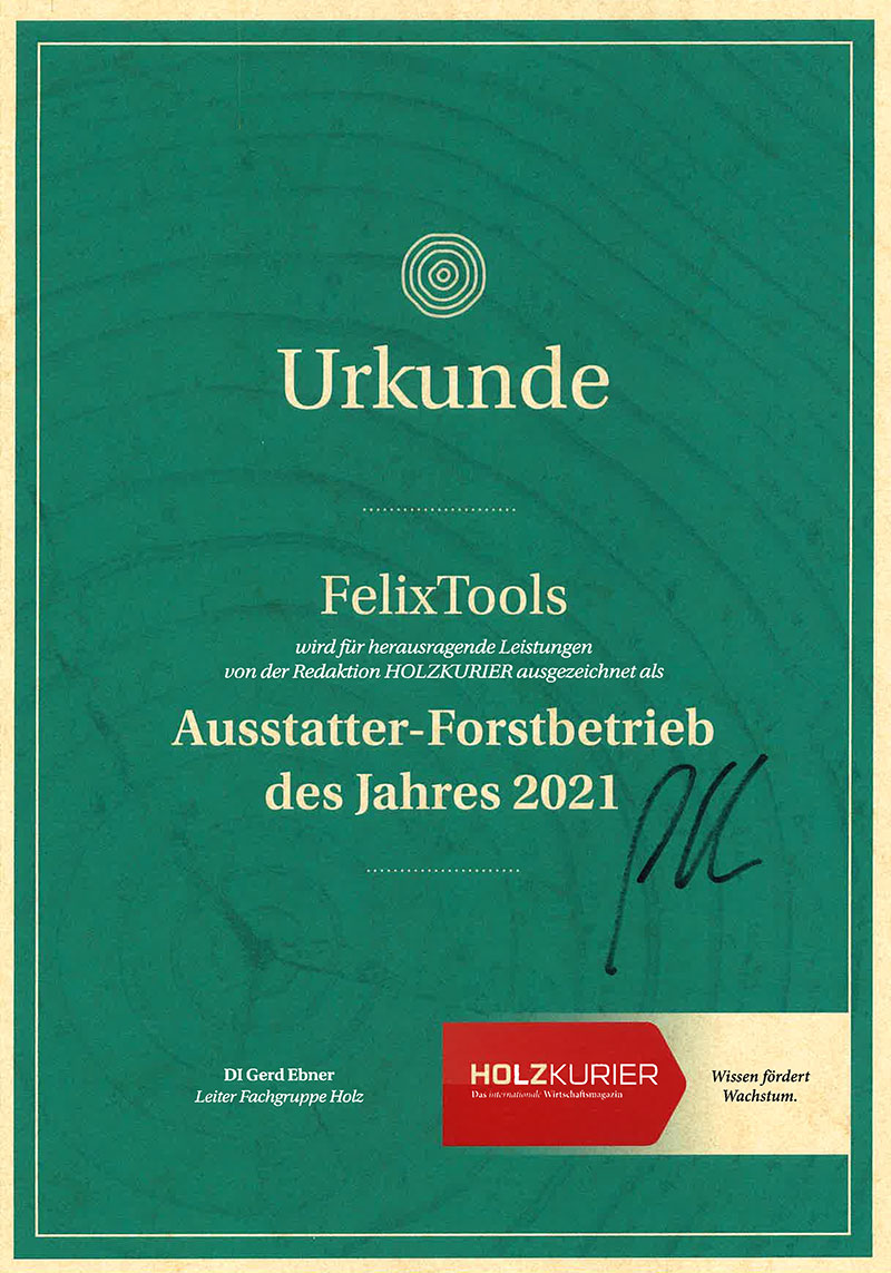 Die Holzkurier-Redaktion kürte FelixTools zum Forstausstatter des Jahres 2021.