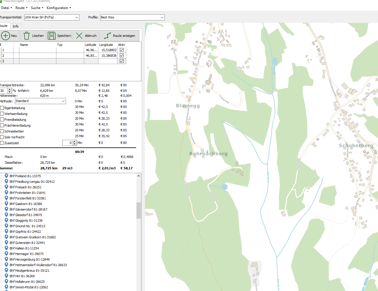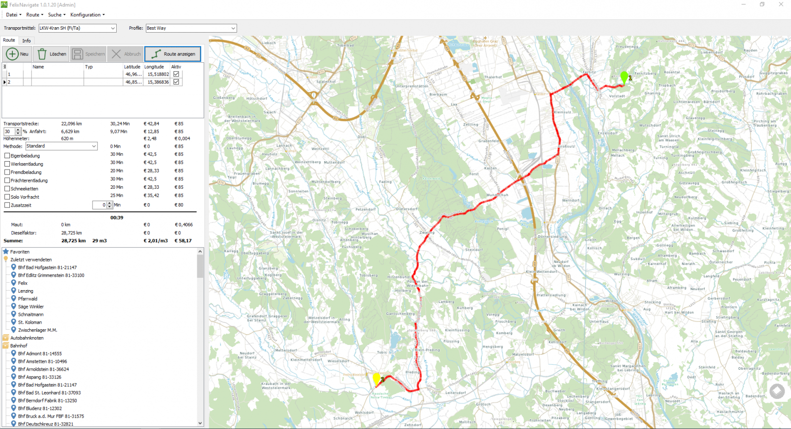 LKW – Routenplanung ist eine komplexe Herausforderung. Tägliche Gedanken über Anforderungen an Transportstrecken beschäftigen viele Firmen. Felix Navigate ist ein Programm, das Routen in der Karte darstellt - Man bekommt Informationen der Streckenlänge, Fahrtdauer, Kosten, aber auch über die Strukturen der Höhen und Straßenbeschaffenheit. Karte für alle Europäische Länder möglich. In kurzer Zeit haben Sie alle wichtigen Zahlen, denn die Nutzung der Routenkalkulation ist intuitiv und übersichtlich angelegt. Sie finden sich sofort zurecht, ohne umständlich nach Funktionen zu suchen.